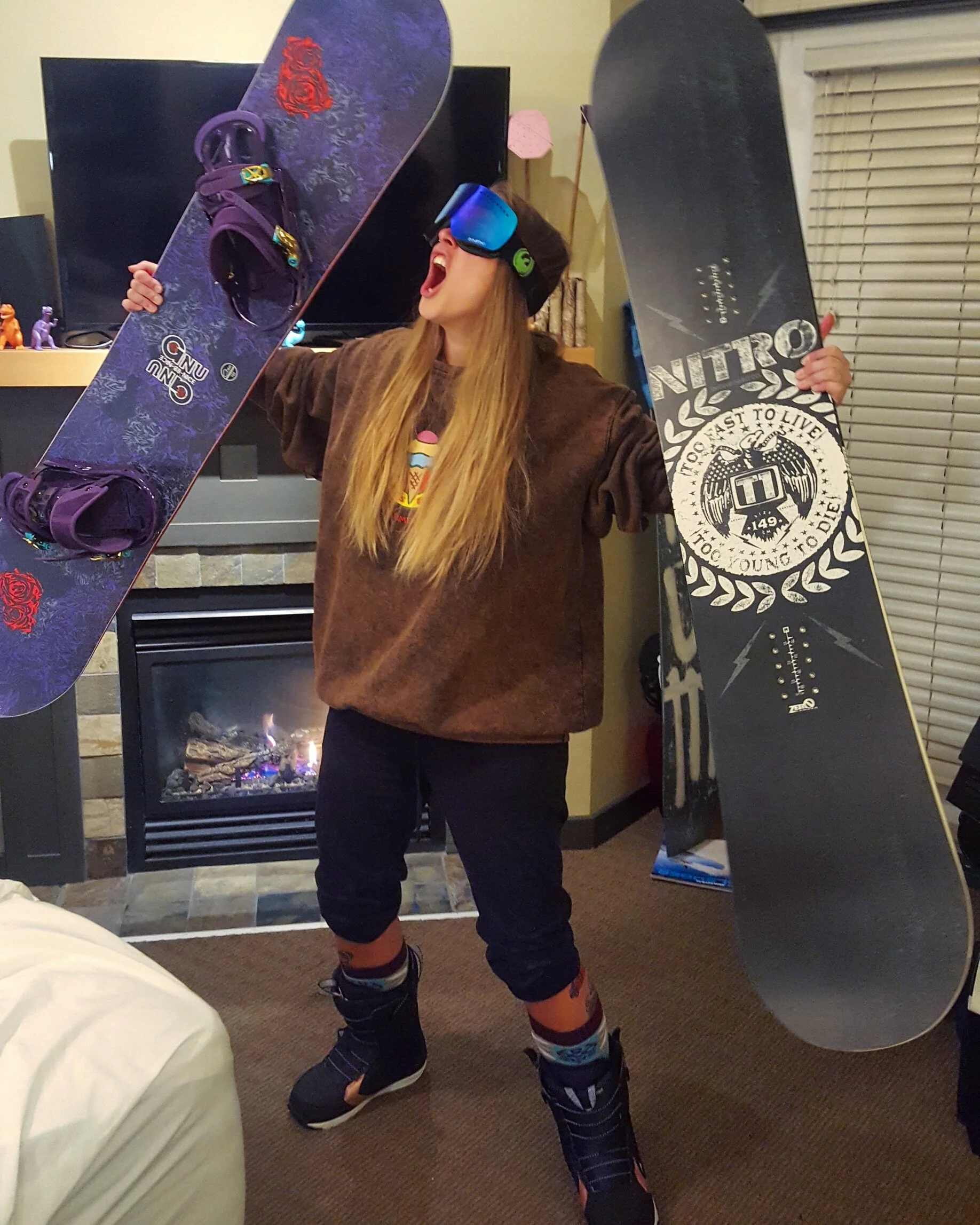 Liza in the snow, surrounded by mountains (her happy place)